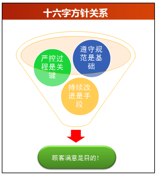以顧客為中心,滿足顧客的需求和期望是我們組織賴以生存和發(fā)展的基礎(chǔ),也是我們的奮斗目標(biāo),每個過程、每個部門都應(yīng)聚焦于滿足顧客需求,為公司的持續(xù)發(fā)展打下良好基礎(chǔ)。顧客不僅包含外部顧客,還包含內(nèi)部顧客,在公司內(nèi)部下道工序是上道工序的顧客,每個人都應(yīng)樹立“顧客”意識,心懷敬畏之心,致力于滿足用戶的需求,響應(yīng)用戶的需要,主動承擔(dān),對結(jié)果負(fù)責(zé),讓“客戶”滿意、放心。