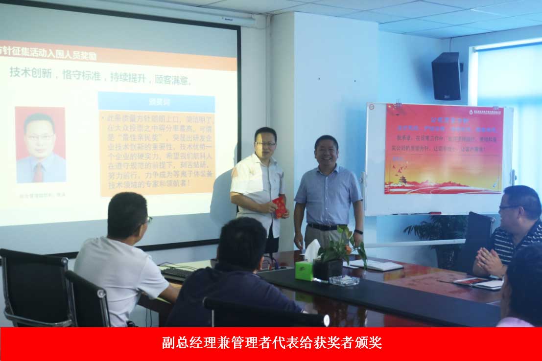 發(fā)布會上,公司對本次質(zhì)量方針征集活動6名入圍人員進(jìn)行了嘉獎,副總經(jīng)理兼管理者代表楊利鋒給獲獎人員進(jìn)行了頒獎,鼓勵全體員工積極參與質(zhì)量管理活動,從自身崗位出發(fā),為質(zhì)量體系的運行做出貢獻(xiàn)。