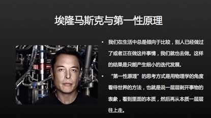 特斯拉的創(chuàng)始人埃隆·馬斯克。馬斯克在很多領(lǐng)域進行了非常多顛覆性的創(chuàng)新,所以很多人問過馬斯克,你為什么能夠做這么多的創(chuàng)新?他的解釋是:“我是用第一性原理來思考這些問題的。”