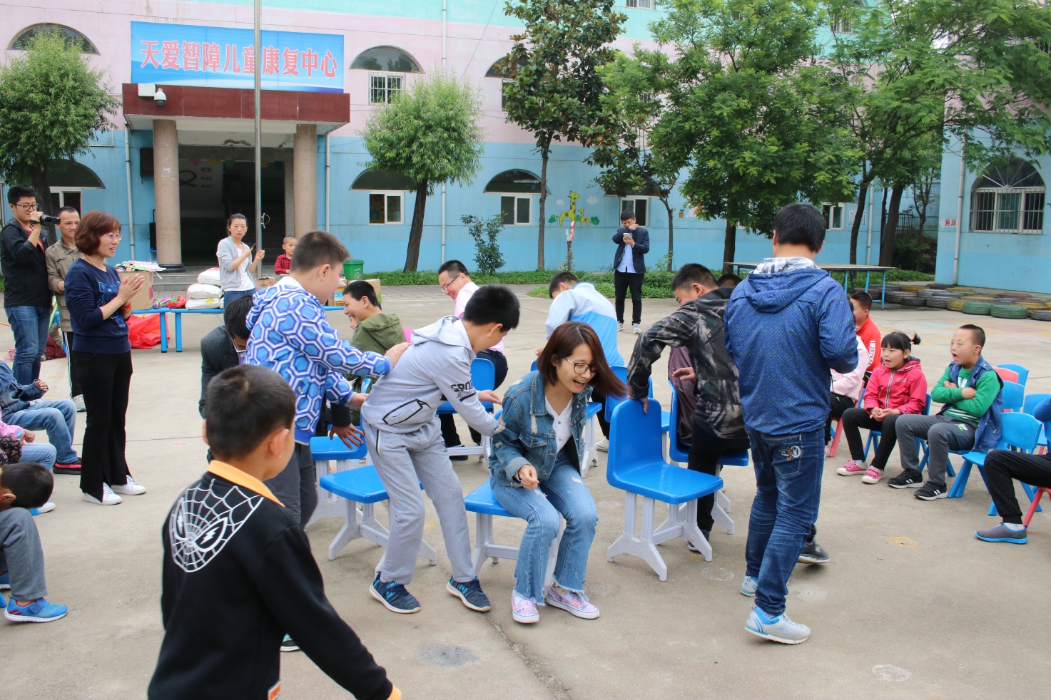 康復中心的孩子大多是智障、自閉癥患者,這些孩子一般缺少安全感,他們在這里接受系統(tǒng)的康復訓練,主要以培養(yǎng)生活自理能力為主,鍛煉他們將來能自食其力。盡管他們不能像同齡兒童一樣正常交流,“你好”、“坐”……,然后拍拍凳子,這也許就是他們最好的表達,但每一個字、每一個詞都袒露出真誠。孩子們對西安航科志愿者叔叔阿姨們的到來極為高興,基于他們的心理特性,從見到我們的那一刻起,就拉住手一直也不松開。在講解航天知識時,他們把志愿者黃微波叔叔圍在中間,嘰嘰喳喳,好奇的問這問那;在做游戲時,他們歡快的像一個個精靈,搶凳子游戲中,志愿者蔡望和王茜也歡樂的像個孩子,西安航科的叔叔阿姨們和天愛的老師們、同學們都沉浸在了歡樂的海洋中。